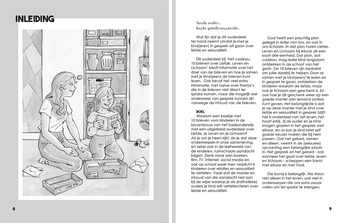 Het project ‘Het cadeau - 10 brieven over liefde, leven en lichaam’ is een nieuw en bijzonder project voor kinderen en ouders om thuis mee aan de slag te gaan. Het is ontstaan uit de behoefte van ouders aan informatie en middelen om aan hun kinderen over te kunnen dragen hoe mooi en goed God de mens heeft geschapen. En dat Hij een prachtige bedoeling heeft gelegd in het lichaam van een man en het lichaam van een vrouw, zodat zij samen kunnen meewerken aan Zijn schepping, het voortbrengen van nieuw leven. Ook zochten ouders handvatten voor die onderwerpen die lastig (kunnen) zijn en vaak tegengesteld zijn aan een katholiek mensbeeld. De opbouw en uitwerking van het project is gebaseerd op de catecheses van Johannes Paulus II die bekend zijn geworden onder naam 'Theologie van het Lichaam'.